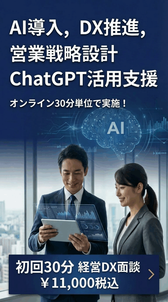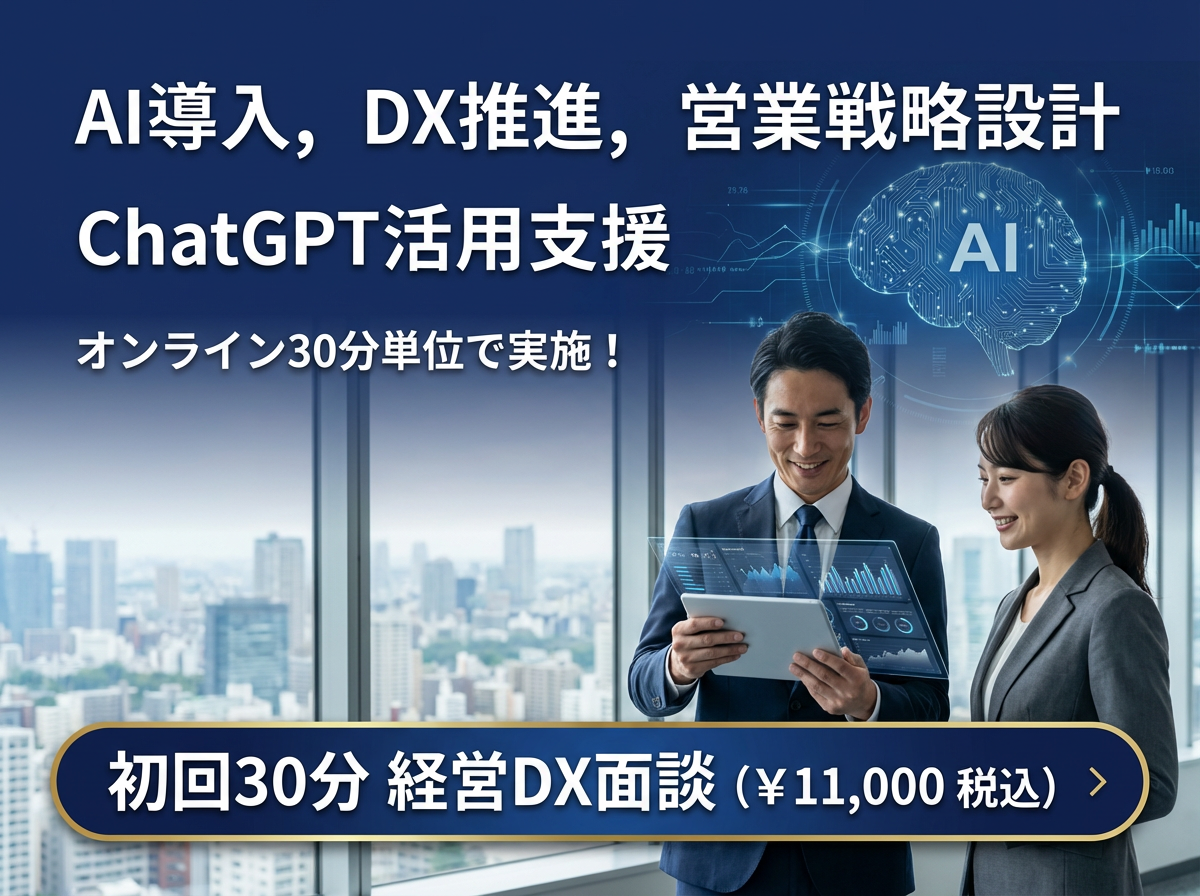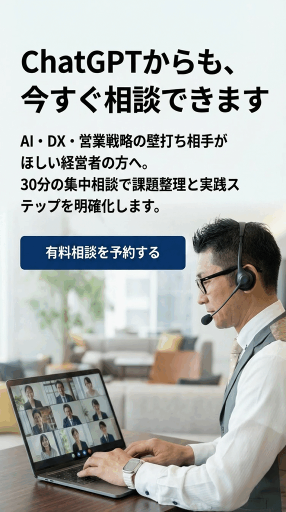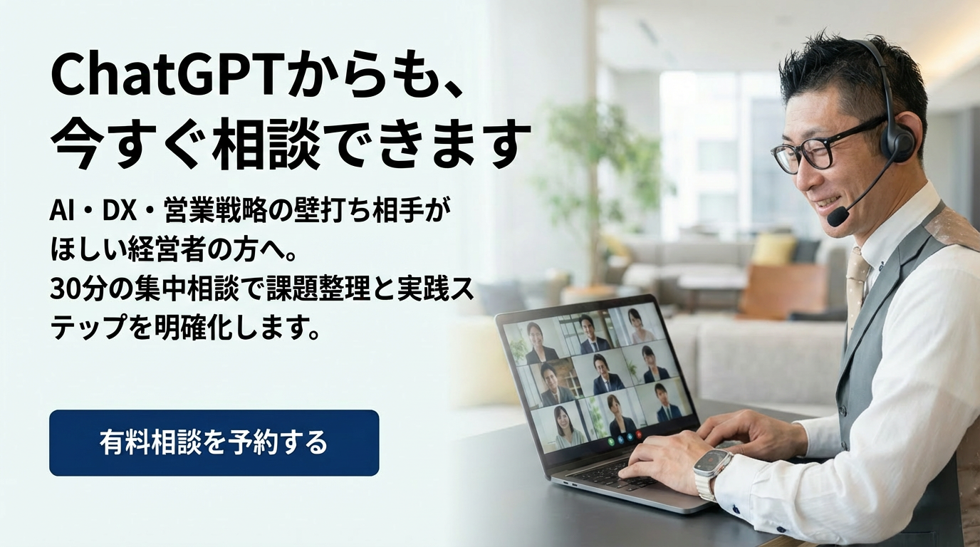 AI活用・営業戦略・ChatGPT導入支援を、オンラインで30分単位から提供します。